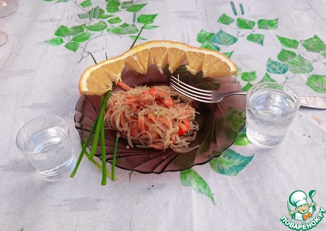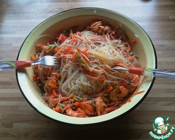 Вот такой вариант салата с фунчозой хочу предложить на Ваше рассмотрение. Как говорится "Простенько но со вкусом". Готовится очень быстро. Креветки прекрасно заменяются любыми морепродуктами или готовым мясом, а можно и просто с одними овощами.