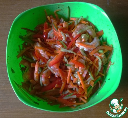 Ваши креветки просто отварены и добавлены в общий салат......в моем случае их после варки маринуют в той самой заправке!!! Это уже 4.