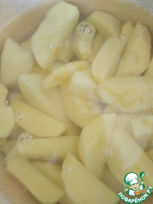 • Картофель почистить, нарезать дольками, поставить варить до полуготовности.