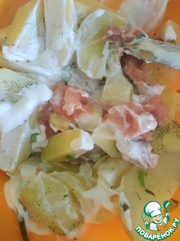 • Рыбу очистить, нарезать на филе, смешать в миске с картофелем. Добавить соль, сметану, зелень, перемешать.