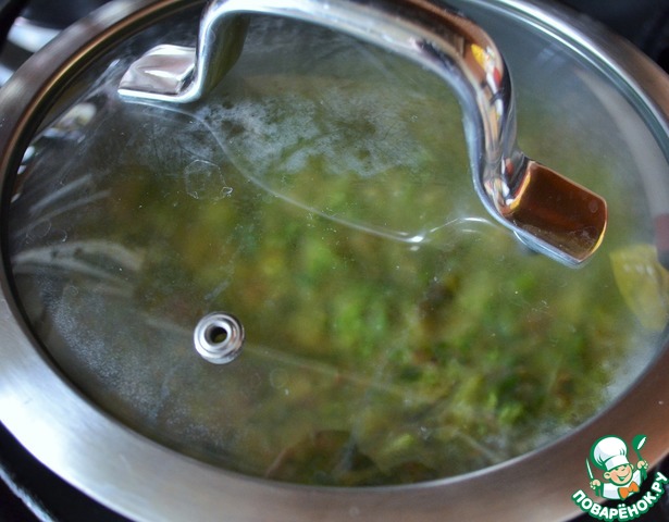 Выложить массу в сковороду, дать закипеть, накрыть крышкой. Огонь убавить до среднего и запекать минут 5-8.