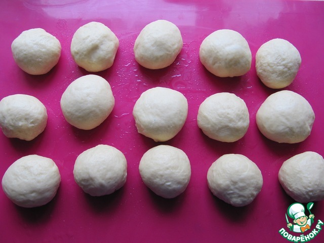 Готовое тесто выложить на рабочую поверхность, которую смазать растительным маслом. Разделить тесто на порционные кусочки, в моем случае это 15 штук по 60 г (примерно). Подкатать каждый кусочек в колобок, оставить под пленкой на 5-10 минут, чтобы было легче раскатывать тесто в пласт.