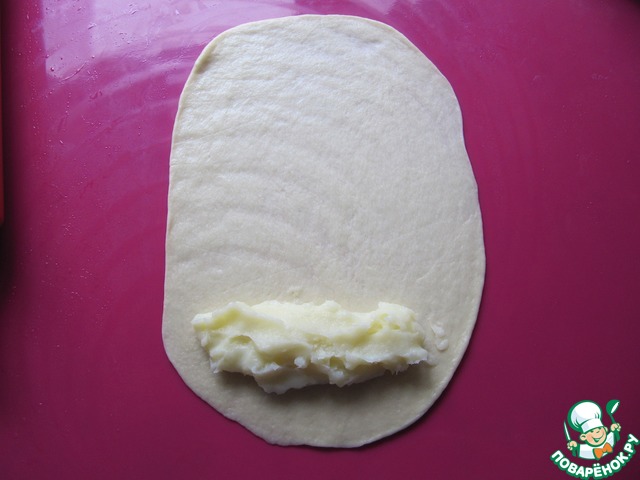 Раскатать каждый кусочек в овал со сторонами примерно 20 и 10 см, выложить порцию крема (1 ст л), отступая чуть от краев.