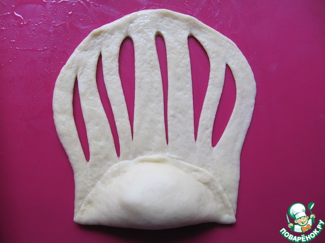 Завернуть крем "вареником", плотно придавить края. Оставшуюся полоску теста надрезать полосками.