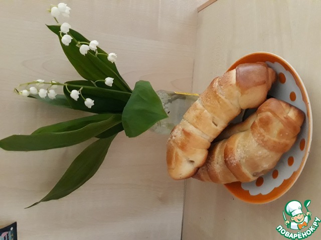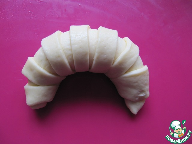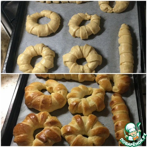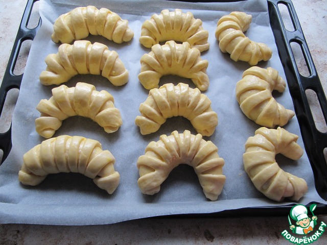 Выложить рогалики на противень, делая отступ друг от друга, поставить на расстойку примерно на 30 минут. Смазать желтком, смешанным с ложкой молока. Выпекать в предварительно разогретой до 180 С духовке да румяного цвета и готовности (проба на сухую лучинку).