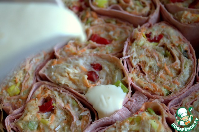 Расстелить лаваш и намазать начинку не до верхнего края. Сбоку я лаваш немного подрезала для дна.