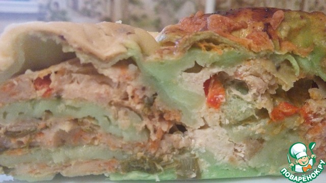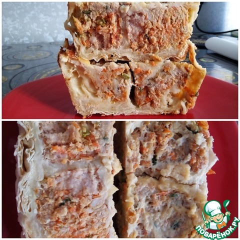 Много начинки и мало теста, которое пропитывается начинкой и становится незаметным. При нарезании пирог хорошо держит форму. Рекомендую в тёплом виде. Готовила из свекольных лавашей и куриного фарша с любимыми добавками. Рецепт не новый, за напоминание спасибо Галине. Высота пирога-7 см Форма диаметром-20 см
