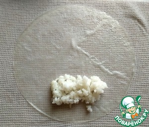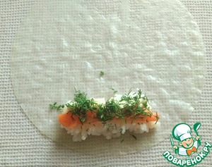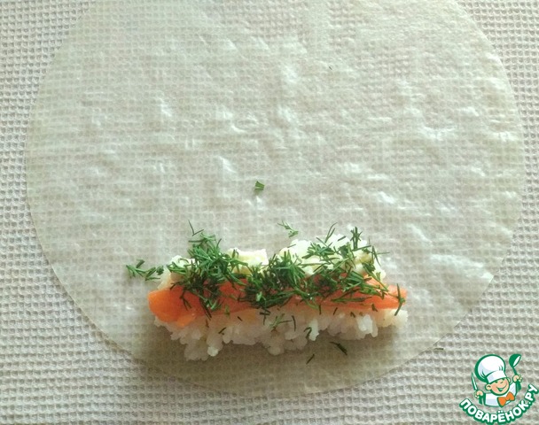 Приготовим все необходимые ингредиенты, отварить рис, нарезать сёмгу полосками, укроп помыть и мелко порезать. Далее будем заворачивать начинку в рисовую бумагу. С рисовой бумагой надо работать быстро, чтобы она не рвалась. Лист рисовой бумаги окунуть в теплую, кипячёную воду буквально на 2 секунды и положить его на разделочную доску. Доску, по желанию, можно застелить влажным полотенцем.