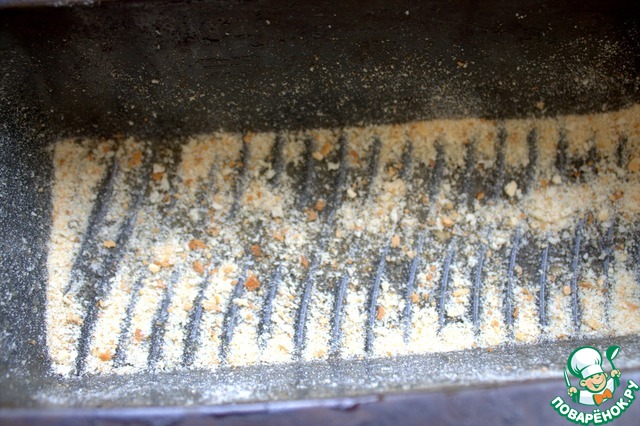 Силиконовую форму "кирпичик" смазать маслом и посыпать сухарями.