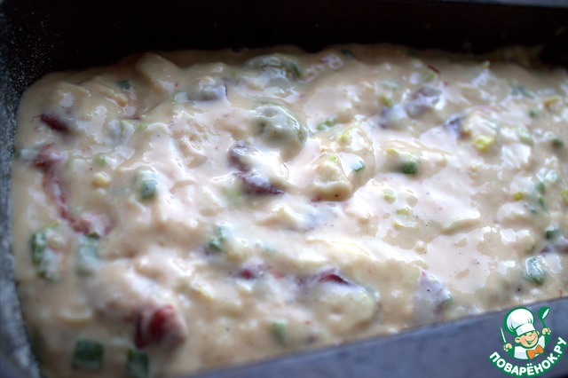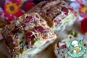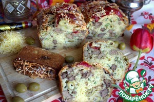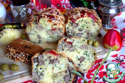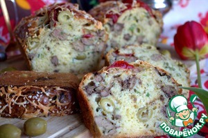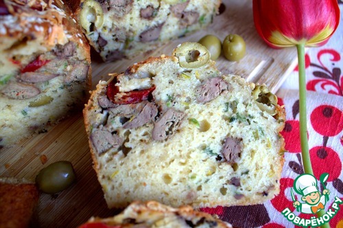 Мягкий, по структуре напоминающий влажноватый хлеб-кирпичик. За основу взяла тесто для закусочного кекса, но добавила свои начинки. Нравится, что печёнку можно не обжаривать и брать из морозилки. Ещё мы любим запечённый болгарский перец, но можете ввести его в тесто кусочками. Если исключить оливки, то вполне бюджетно. Форма размером: 23 см на 9,5 см Высота хлеба: 8 см по центру