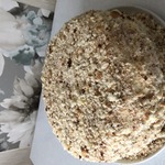 Все коржи обмазаны кремом. Теперь приступим к обсыпке. Обрезки измельчим в блендере или в мясорубке или кому как нравится и обсыплем торт сверху и с боков. Теперь можно удалить бумагу, которую подстилали под торт, - подставка осталась чистая.