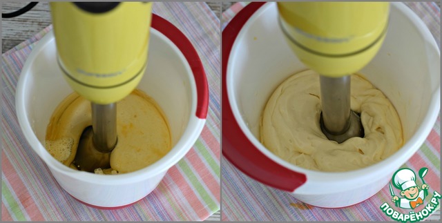 Постепенно поднимать блендер от дна емкости (эмульсия будет подниматься за блендером), а затем движениями сверху вниз продолжить взбивать майонез до однородности.