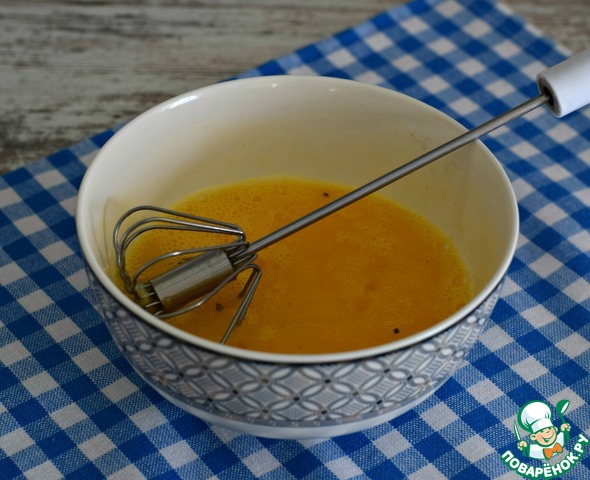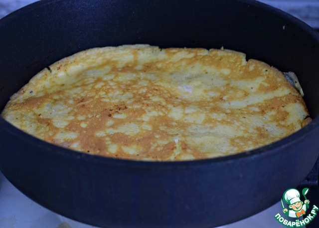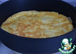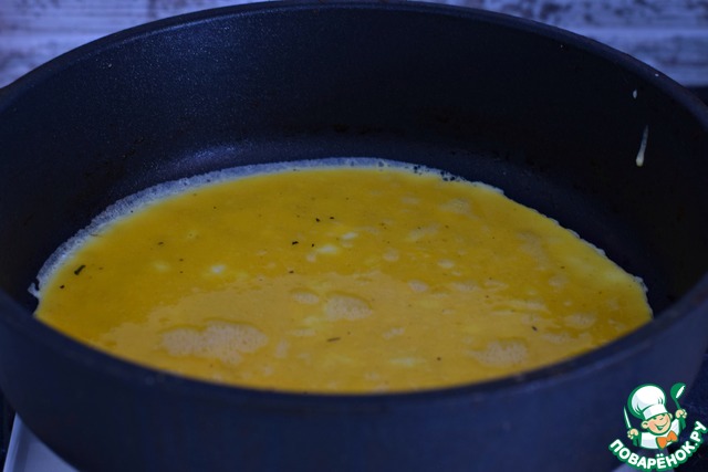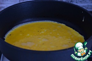 В сковороде хорошо разогреть растительное масло, влить в сковороду яичную смесь и поджарить блинчик.