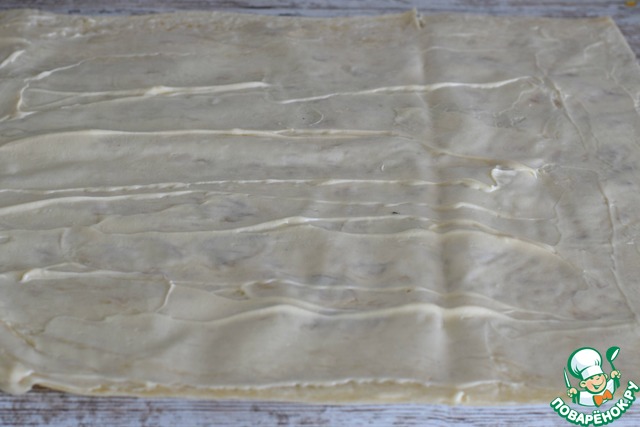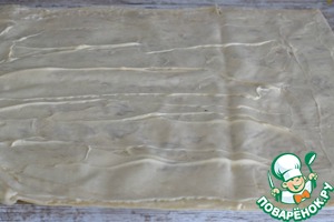 Нужен тонкий бездрожжевой лаваш, примерно 100 г, размером 30*40 см. Лаваш равномерно смазать майонезом.