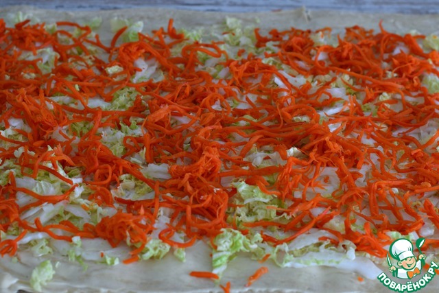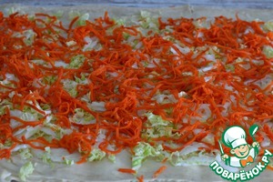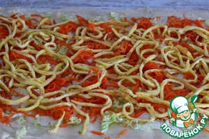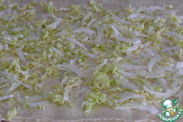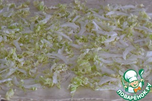 На майонез разложить пекинскую капусту, нашинкованную соломкой. Пекинку можно заменить на капусту молодую. Тоже отлично получается.