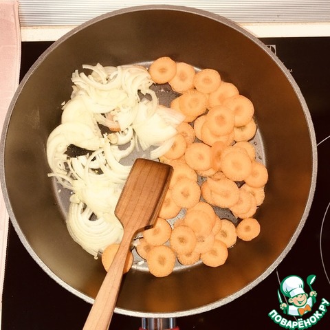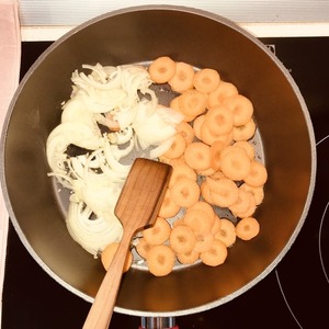 Лук нарезать полукольцами, морковь нарезать тонкими кружками. Сковороду поставить греться на среднем огне, добавив 1 ст. ложку кокосового масла. На прогретой сковороде припустить овощи до мягкости, периодически помешивая.