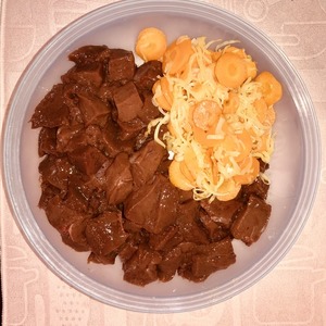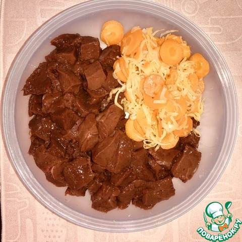 Пока овощи доходят до кондиции займёмся печенью: снять пленку, нарезать некрупными брусочками, удаляя протоки. Овощи стали мягкими, снимаем их со сковороды и даём остыть, соединяем с печенью.