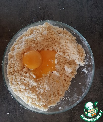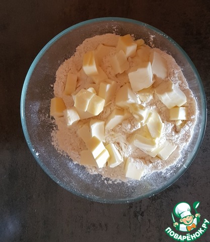 Просеянную муку смешать с разрыхлителем и добавить резанное, холодное сливочное масло. Перетереть в крошку.