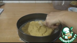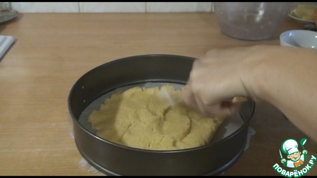 Форма 28 см, я дно застелила пергаментом. Выкладываем тесто и лопаткой распределяем по поверхности формы, можно помогать руками. Можно сделать бортики, я иногда делаю иногда нет. Отправляем в разогретую до 180 градусов духовку на 20 минут.