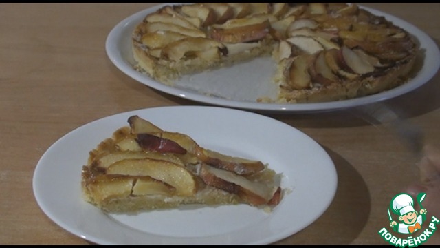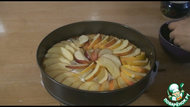 Когда тесто запеклось, выкладываем сверху нарезанные тонкими дольками яблоками внахлест.