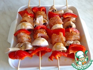 Собрать шашлычки: на шпажки нанизать кусочек мяса, кусочек перца и половинку гриба, дальше – в том же порядке.