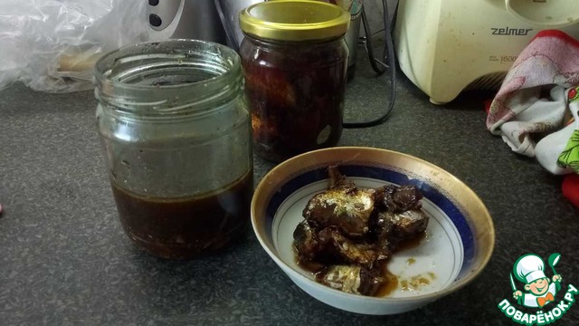 После чего процедил и залил в 0.5л банки. Рыбу клал на два пальца ниже края банки.