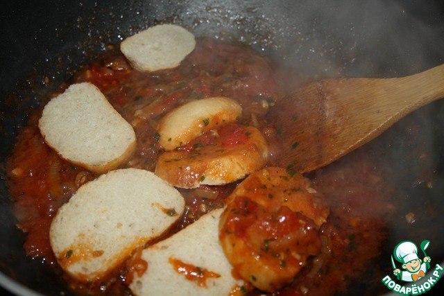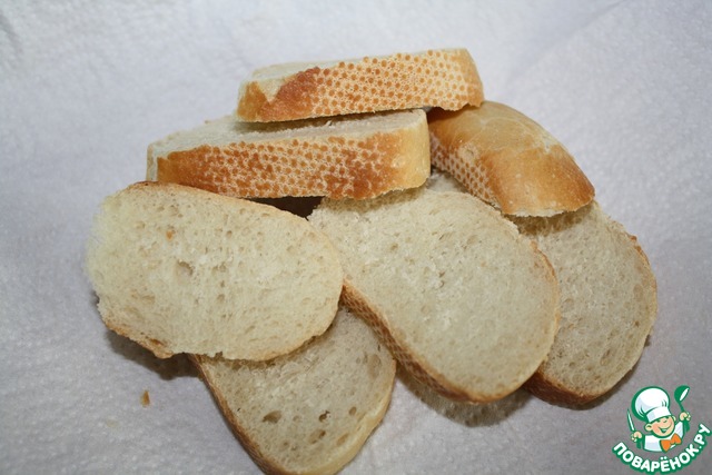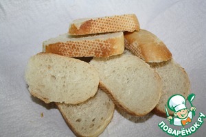 Багет или булочку нарезать крупными колечками, если у вас лепешка, то наломать крупными кусочками.