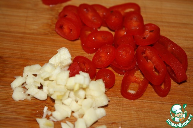Добавляем чеснок, перец чили, черный перец и соль по вкусу.