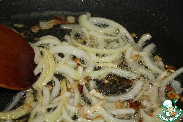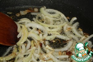 Раскалить масло и обжарить лук до золотистости посыпав его щепоткой сахара. -