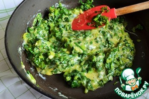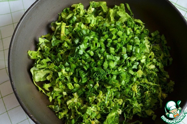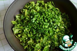 В это время приготовить начинку, зелень вымыть, просушить и нарубить мелко. На 1 ст. л. сливочного масла прогреть и слегка обжарить зелень.