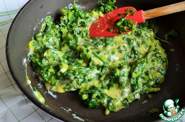 Яйца взбить, добавить к зелени, прожарить до готовности яйца. Посолить, заправить молотым перцем.