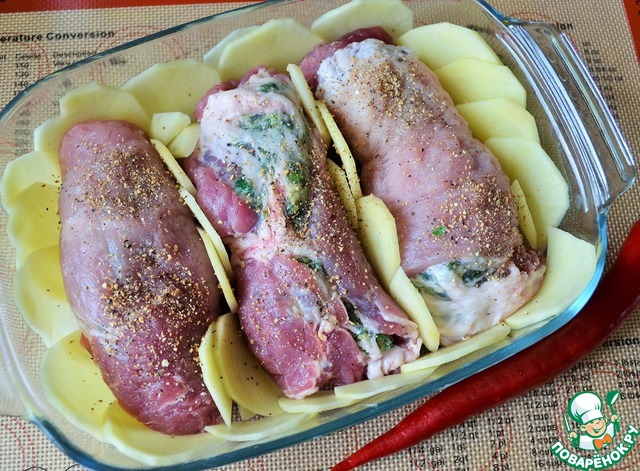 Картофель и чеснок почистить, нарезать тонкими слайсами, выложить дно и стенки формы. На картофель поместить заготовки рулетов, поперчить. -