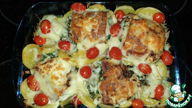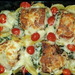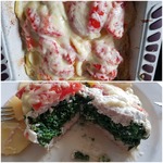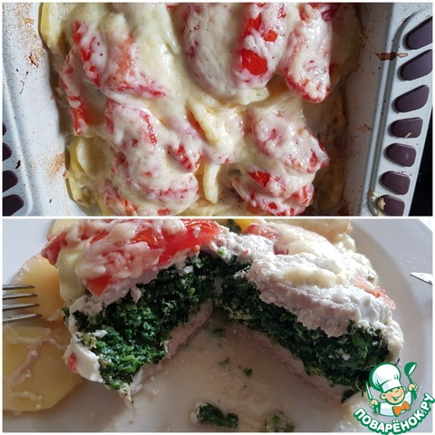 [+1]Во-первых, несмотря на то, что я добавила гораздо меньше 50 мл воды, вся форма в конце оказалась залита жидкостью. Начинку (шпинат с базиликом) я жарила до сухости, вода была выпарена. Получилось тушеное, а не запеченное блюдо.