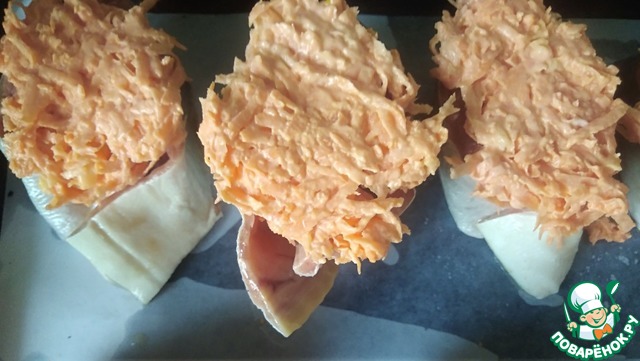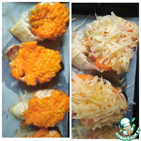 Выкладываем морковную смесь на на наши стейки и отправляем в духовку разогретую до 180 градусов на 25 минут, пока рыба запекается натрем сыр на мелкой терке