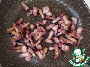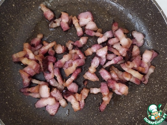 Обжарим грудинку. Если выделится много жира - слейте излишек, чтобы не утяжелять пасту. Как только приготовится - выключим огонь, накроем крышкой и отставим в сторону.