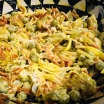 5) В салатнике соедините мясо, морковь, лук и консервированный горошек (предварительно слив с горошка лишнюю жидкость).