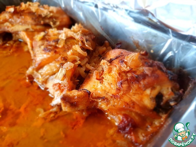 Достать через 20-25 минут форму из духовки. Нарезанный лук равномерно выложить на куриные бедра. Полить оставшимся маринадом.