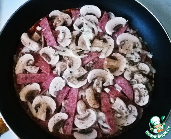 Перенесите пиццу на сковородку (к этому моменту она уже хорошо нагрелась). посыпьте специями и базиликом, уменьшите огонь до самого маленького и выпекайте под крышкой минут 8-10, пока не расплавится сыр и не приготовится начинка.