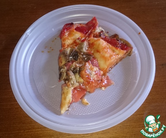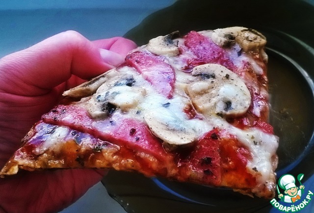 Через 10 минут пицца готова! Выложите ее на тарелку и разрежьте)