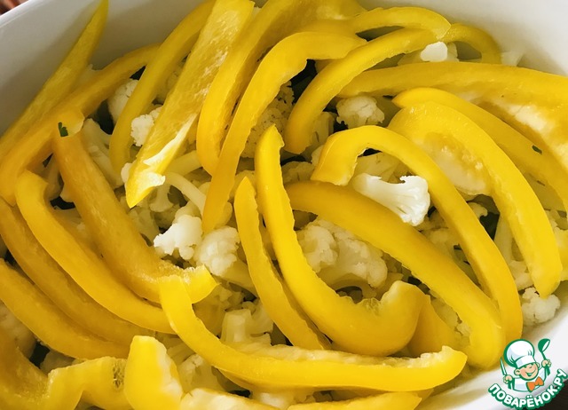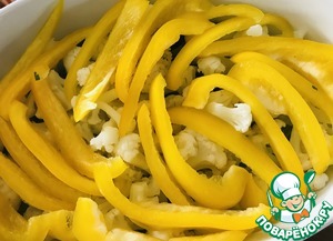 Порезать болгарский перец (как вам удобно) положить на цветную капусту.