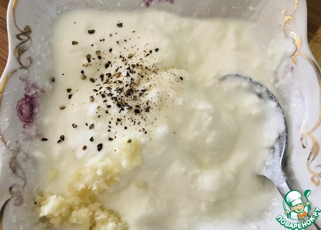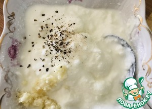 Йогурт греческий (сметану, сливки) посолить, добавить душистый чёрный перец, перец Чили, выдавить чеснок через чеснокодавилку, все хорошо перемешать.