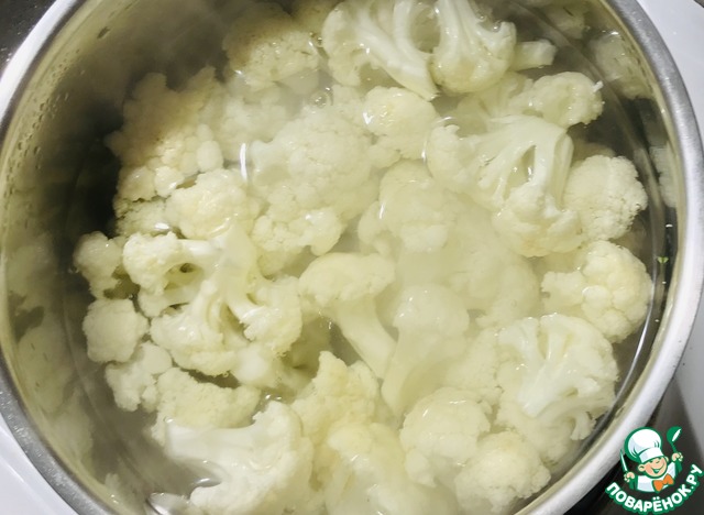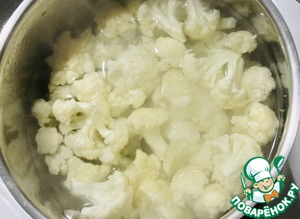 Цветную капусту разобрать на соцветия, промыть холодной водой, в кастрюлю налить воды, подсолить, в горячую воду опустить цветную капусту, проварить 5-7 минут.