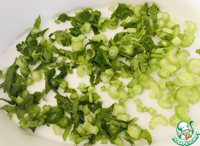 В форму удобную для вас, (которую ставят в духовку ) мелко нарезать сельдерей.