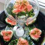 Маринованный имбирь предварительно слегка отжать от маринада и нарезать полосками.