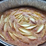 Вишню присыпать мукой и добавить в тесто. Яблоко почистить и очень тонко порезать. Сверху выложить на тесто. -