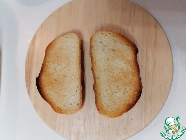 Подсушить в тостере или в духовке ломтики батона до румяной корочки (необходимо, чтобы хлеб оставался мягким внутри и хрустящим снаружи).