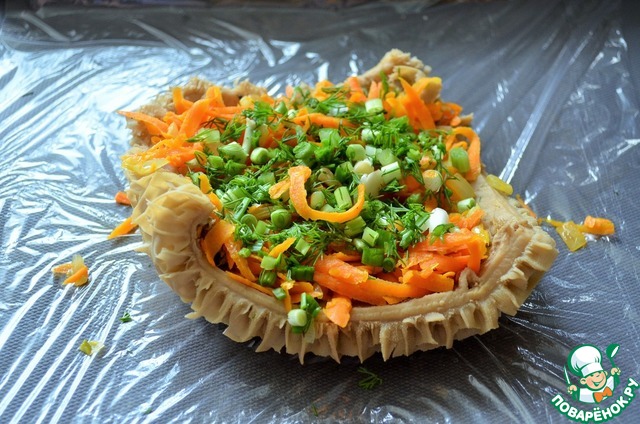 Горячий кусок рубца выложить на плёнку (целлофан), на рубец начинку, рубленную зелень.