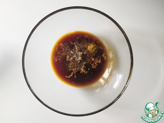 Смешаем соевый соус, мёд, лимонный сок, кунжутное масло, чеснок, имбирь, черный перец.
