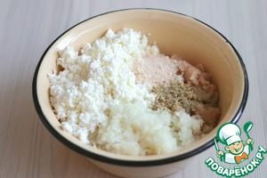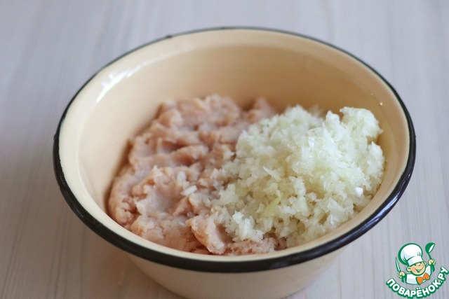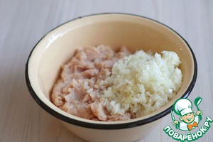 Куриное филе с куриной грудки (600 гр.) пропустить через мясорубку, добавить измельченный репчатый лук (1 шт.)