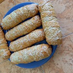 Пирожки выложить на противень, застеленный пергаментом, или выложить на силиконовый коврик для выпекания. Пирожки смазать взбитым яйцом, посыпать кунжутом и отправить в разогретую до 190-200С духовку. |
